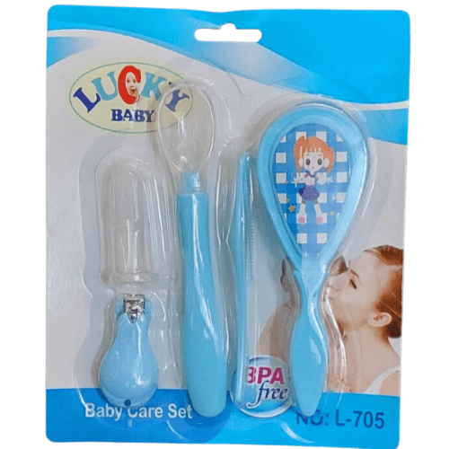 طقم العناية بالطفل لاكى 5×1 لأنها بتتكون (فرشاة – مشط – قصافة – منظف لسان- مهاقة سيليكون).