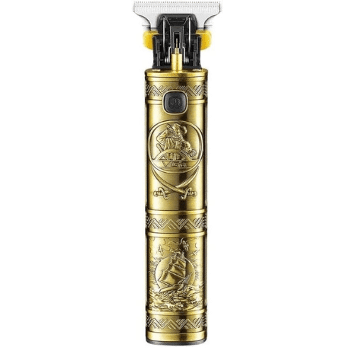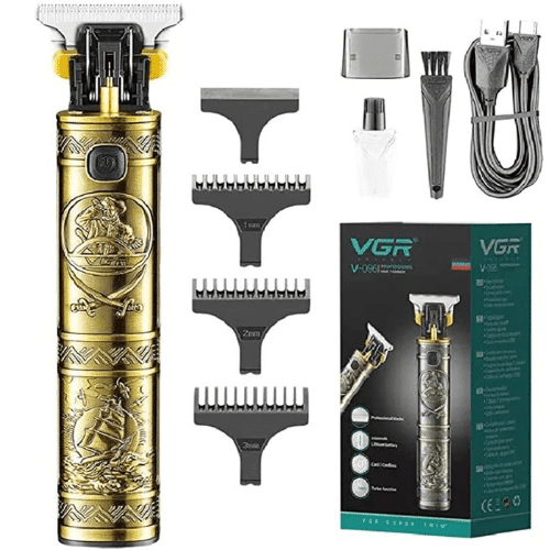 ماكينة حلاقة الشعر مصنوعة من هيكل معدني ذهبي فاخر مع لمسة نهائية مزخرفة ومجهزة بشفرات من الستانلس ستيل عالي الجودة لتجربة تصفيف فعالة ودقيقة من في جي ار، موديل V-096 يتميز بوضع تيربو لتحسين تجربة العناية الشخصية.